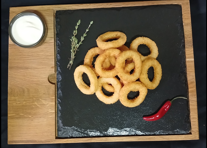 Хрусткі цибулеві кльця з медово-соєвим соусом